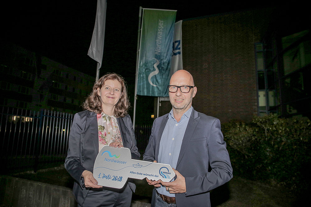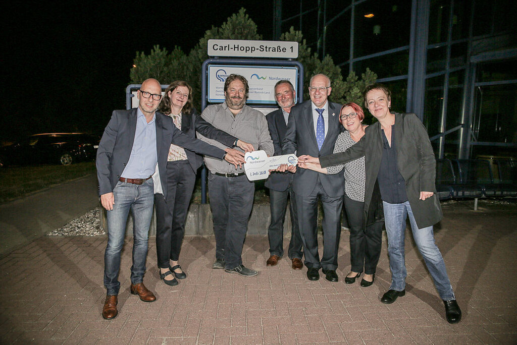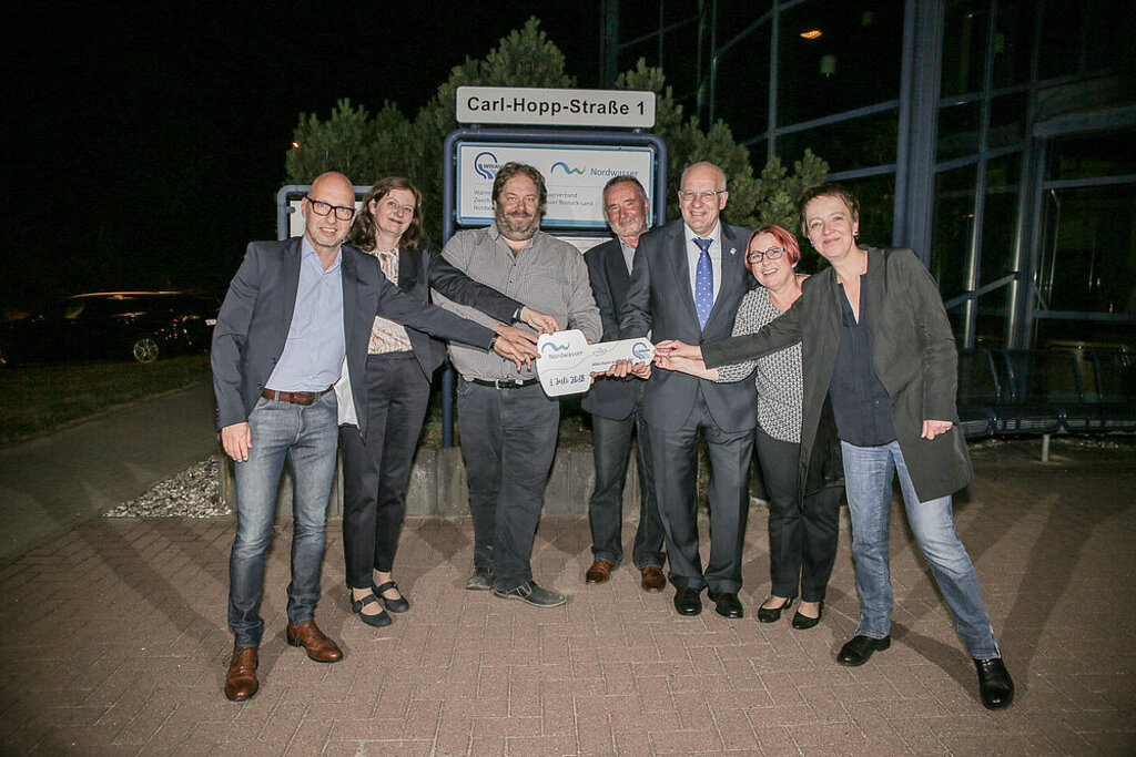 „Wasser marsch!“ hieß es in der Nacht zum Sonntag, dem 1. Juli, für die Nordwasser GmbH. Um Punkt 00.00 Uhr übernahm der Kommunalbetrieb im Auftrag des Warnow-Wasser- und Abwasserverbandes (WWAV) mit einer symbolischen Schlüsselübergabe die Wasserversorgung und Abwasserentsorgung für die Hanse- und Universitätsstadt Rostock und die 28 Mitgliedsgemeinden des Zweckverbandes Wasser Abwasser Rostock-Land von der EURAWASSER Nord GmbH.